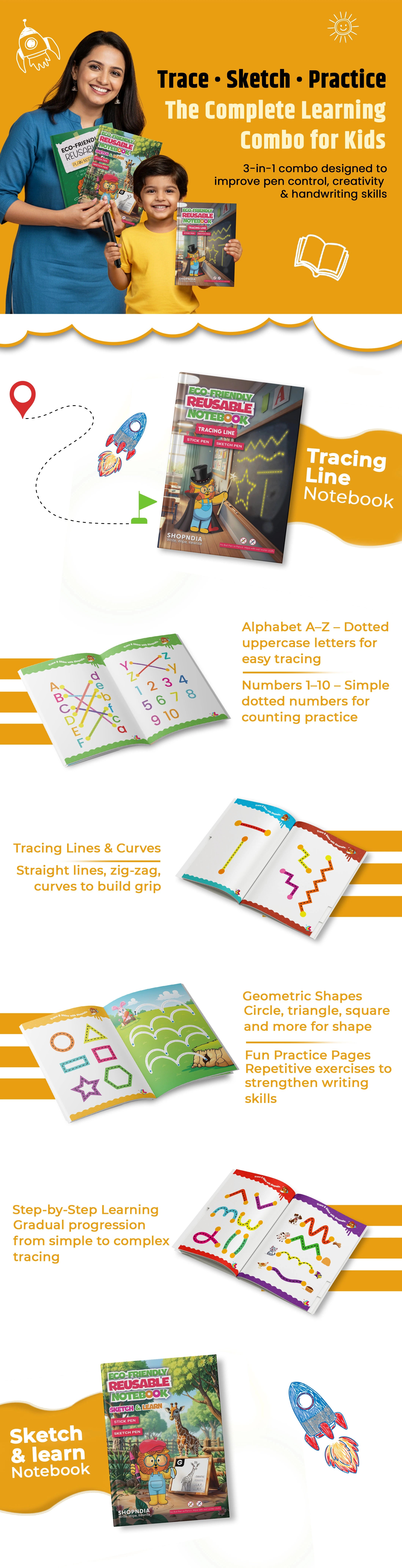 Make learning exciting and eco-friendly with our Tracing Line Book Combo Set — designed to help kids learn, draw, and practice creatively without wasting paper!
